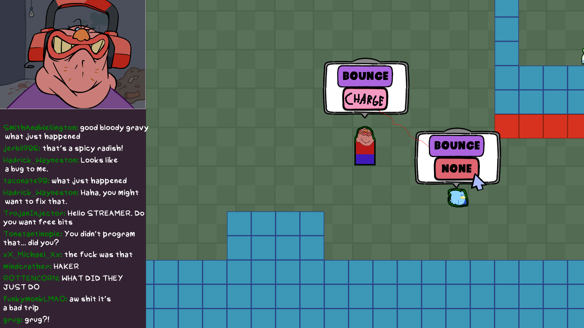 Use [WASD] to move Pasquallio Bloagio around, [SPACE] to use special actions, and, most-devilishly, [left-click] enemies to steal their variables and enter debug mode. Collect coins. Turn chat to your side. Defeat the streamer.